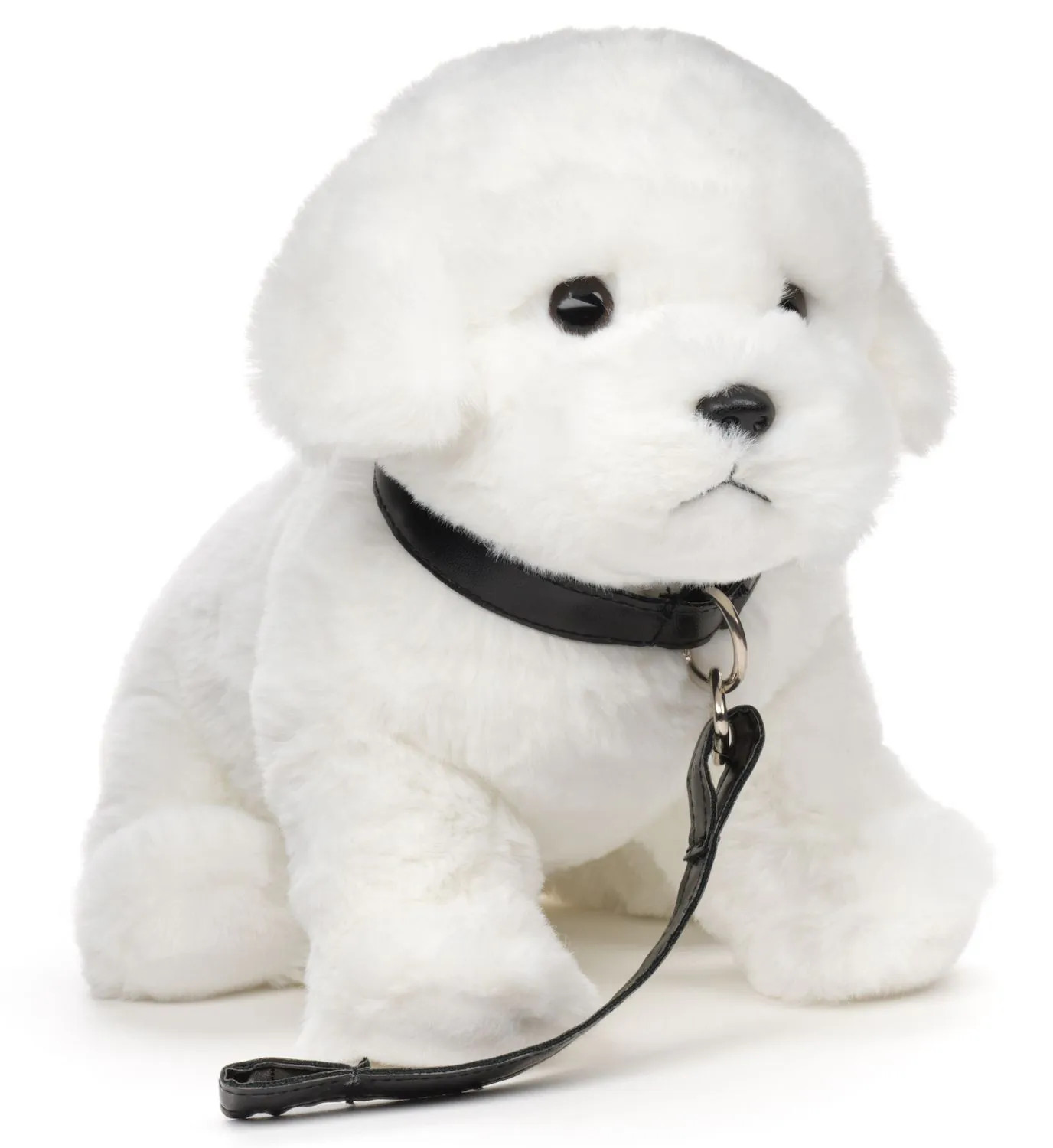 Álló, fehér, máltai selyemkutya pórázzal a nyakában
